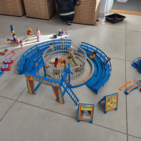 Playmobil cirkus legesæt med stor rund manege, tilskuerpladser og indgangsportal. Sættet indeholder flere Playmobil-figurer, herunder cirkusartister, klovne, publikum og cirkusdirektører. Der medfølger dyr som heste og løver samt tilbehør som tromme, podier, tønder, ringe og andre små dele til cirkusopstillinger. Egnet som byggesæt og rolleleg for børn, der vil opstille og lege forskellige cirkusscener.