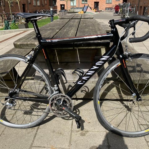 Super let racercykel fra Canyon monteret med den lækre Campagnolo Record geargruppe (carbon med carbon på) og Campagnolo Bora carbon hjulsæt alt i alt 6.8kg uden pedaler så en fornøjelse at køre opad på, ned ad eller bare lige ud. Medfølger også et sæt Campagnolo alu hjul. Den har stået til opbevaring indendørs de sidste 1,5 år da jeg har mistet interessen. Kan hentes fra opbevaringen til fremvisning med et par timers varsel