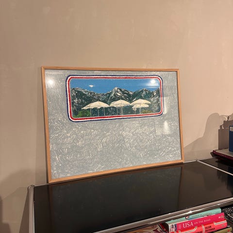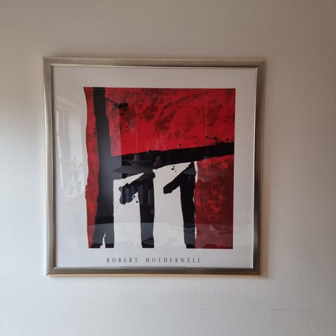 Wistremundo Artero kunstplakat med figurmotiv i flere farver. Plakaten viser et centralt, rosa figurmotiv omgivet af mørkere figurer og grafiske linjer. Trykket er monteret i en lys passepartout og indrammet bag glas i en enkel ramme. Velegnet til ophængning i stue, kontor eller andre rum, hvor man ønsker et kunstnerisk udtryk på væggen.