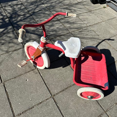 Brugt børne trehjulet cykel med 10" hjul. Cyklen har gul styr og stel med røde og grønne detaljer samt en rød ladekasse bagpå. Sædet er polstret og pedalerne er placeret på forhjulet. Velegnet til mindre børn, der skal øve balance og motorik på en trehjulet cykel. Mærke: Winther