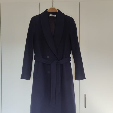 Uldfrakke, str. 34, J. Lindeberg, Sort, 80% uld og 20% polyester, Næsten som ny, Dobbeltradet uldfrakke med bælte, skulderstropper samt skinddetaljer.