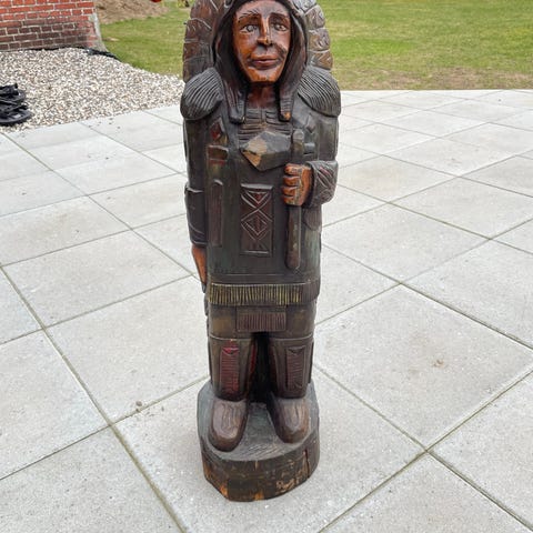 Ukendt mærke håndskåret træfigur forestillende en heks på kost. Figuren er udført i massivt træ med tydelige udskæringer og naturbrun overflade. Motivet viser en siddende heks med spids hætte, der holder en kost i hænderne. Egnet som dekoration i hjemmet, f.eks. på hylde, vindueskarm eller i en samling af træfigurer.