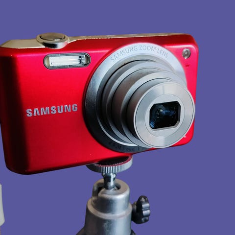 Samsung digitalkamera med 12,2 megapixel opløsning. Kameraet er i kompakt lommestørrelse med sort kabinet og sølvfarvet objektivring. På forsiden ses indbygget blitz, og på bagsiden et display samt knapper til navigation og indstillinger. Kameraet har udtrækkeligt objektiv og håndledsrem. Medfølgende lille taske/etui til, som vist på billederne. Bruger AA batterier.