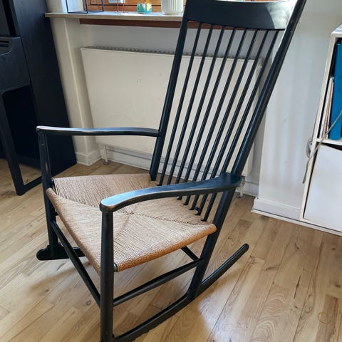 Hans J. Wegner gyngestol med høj ryg i sort træ, flet og læderhynder