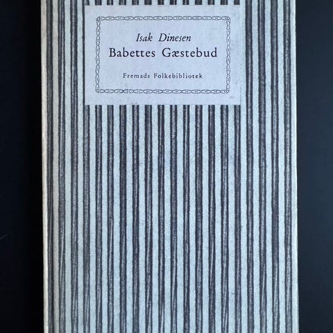 Isak Dinesen "Babettes gæstebud" bog. Dansk sproget udgave udgivet af Forlaget Fremad. Indbundet med stribet omslag. Skønlitterær tekst med løbende sidenummerering og klassisk satslayout. Velegnet til læsning for interesserede i dansk litteratur og Isak Dinesens forfatterskab.