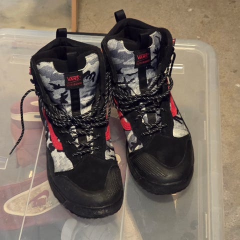 Vinterstøvler i størrelse 12, som svarer til en EU str 46. Støvlerne er højskaftede med snørelukning foran. Overdelen er i brun overflade med sort, vandafvisende gummidel omkring foden og grov gummisål med mønster for bedre fodfæste. Indvendigt er der blødt, lyst for, som dækker hele skaftet for ekstra varme. Velegnet som vinter- og efterårsstøvler til udendørs brug i koldt og vådt vejr.