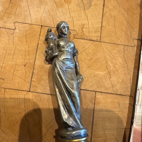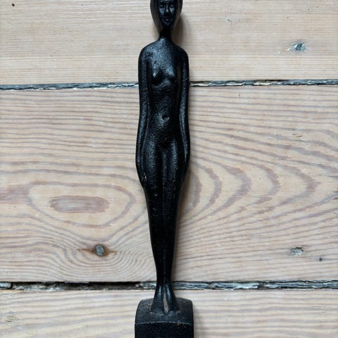 Flaskeåbner udformet som en kvindefigur i metal. Motivet viser en nøgen kvinde set forfra og bagfra med armene løftet over hovedet, hvor selve åbnerdelen er placeret. Overfladen har patina, som giver et ældre udtryk. Velegnet som praktisk køkkenredskab eller som dekorativ genstand i bar- eller køkkenmiljø.