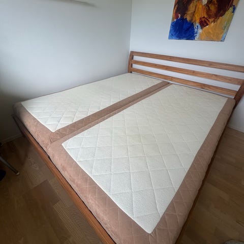 Sengen passer til 2 x 90-madrasser. Madrasserne er af god kvalitet men af ældre dato og kan følge med, hvis man ønsker det.