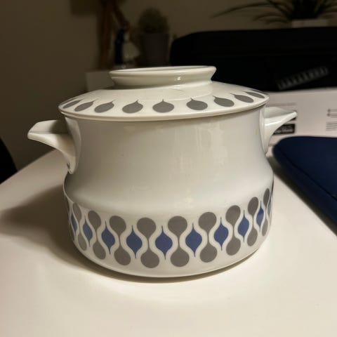 Iittala gryde med låg i blå og hvid. Gryden har sort hank i hver side og sort knop på låget. Ydersiden er hvid med blåt mønster, og låget er mørkeblåt. Indersiden er lys med synlige brugsspor. Egnet til madlavning og servering i køkkenet.