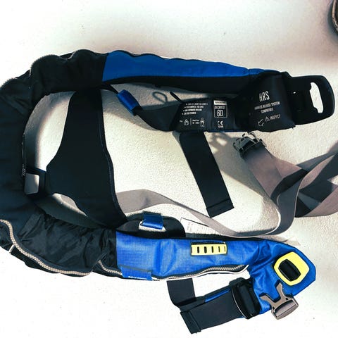 Oppustelig redningsvest med justerbare remme og reflekser på forsiden.