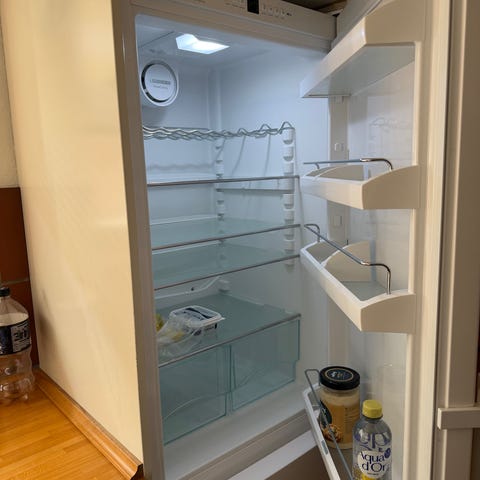 185 cm højt køle-/fryseskab. Køleskabet har et rummeligt kølerum på 220 liter øverst dør, og tre fryseskuffer med et volumen på 110liter.