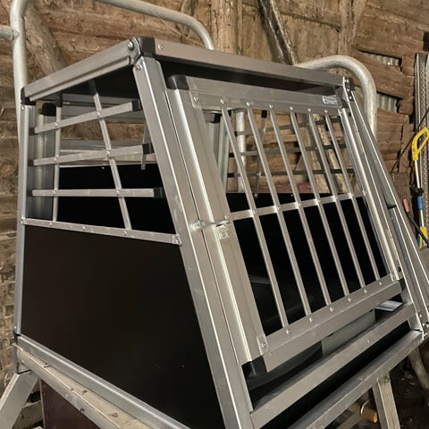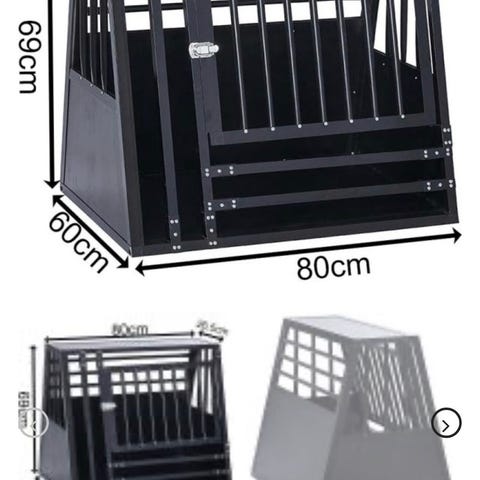 Doggy 65 hundebur til hatchback bil i aluminium. Buret er udformet til montering i bagagerummet på mindre biler med skrå bagklap. Konstruktionen er i let aluminium med gitter foran og lukkemekanisme i døren. Sider og bund er lukkede for at beskytte bilens interiør. Buret har skrå for- og bagkant, så det kan udnytte pladsen i bagagerummet. Velegnet til transport og sikker opbevaring af hund i bilen. Mål fremgår af sidste billede med skitse og angivne længder, bredder og højder.