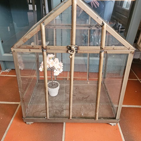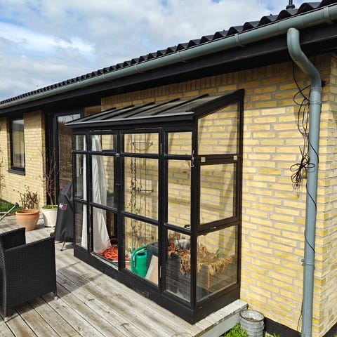 Vægdrivhus i polycarbonat. Vi har købt et nyt i glas, så det her kan hentes gratis. Det står og klaprer og larmer fordi det står lidt udsat på vores terasse.