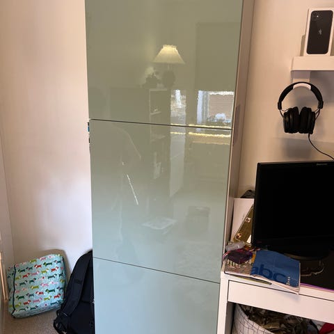 Bestå skab med mørkebrun stel og højglans hvide låger.