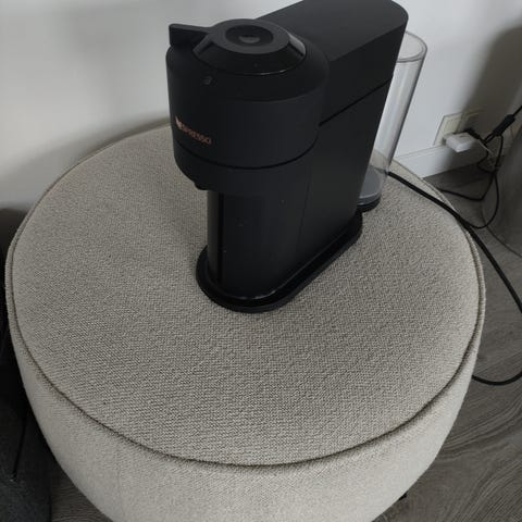 Nespresso Vertuo Next kapsel kaffemaskine i sort og grå. Maskinen anvender Nespresso Vertuo-kapsler og har aftagelig vandtank bagtil. Den er egnet til brygning af enkeltkopper kaffe i forskellige størrelser afhængigt af kapseltype. Designet er kompakt og lodret, så den fylder minimalt på køkkenbordet. Strømkablet er placeret bag på maskinen. Maskinen betjenes fra toppen med låg til indsætning og udtagning af kapsler.