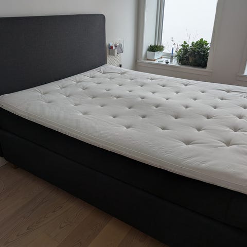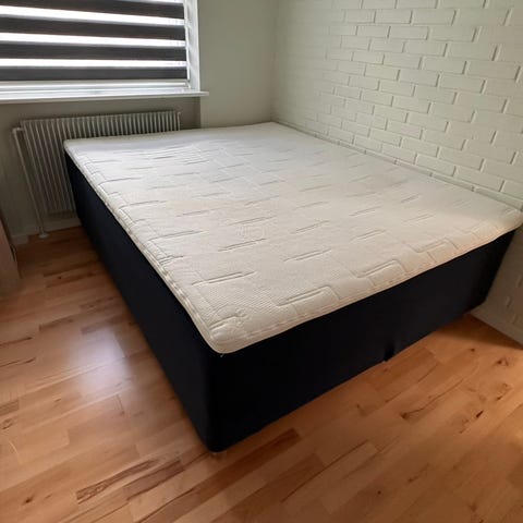 Norhland kontinentalseng i grå tekstil med matchende sengegavl. Sengen består af en polstret bund og madras med quiltet hvid topmadras øverst. Designet er enkelt med lige linjer og en høj gavl, som giver støtte, når man sidder op i sengen. Egnet som dobbeltseng i soveværelse eller gæsteværelse. Dansk design og håndværk ifølge mærket på sengerammen.
