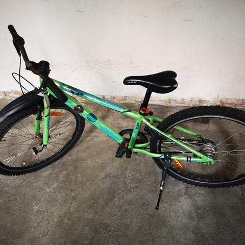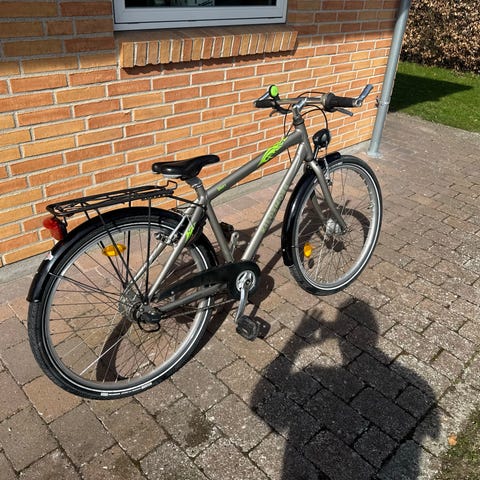 Kildemoes børnecykel med 26" hjul i grøn/sort. Cyklen er udstyret med affjedret forgaffel, gear og fodbremse kombineret med håndbremser. Egnede dæk til kørsel på både vej og let terræn. Cyklen har støtteben, skærm foran og reflekser på hjulene.