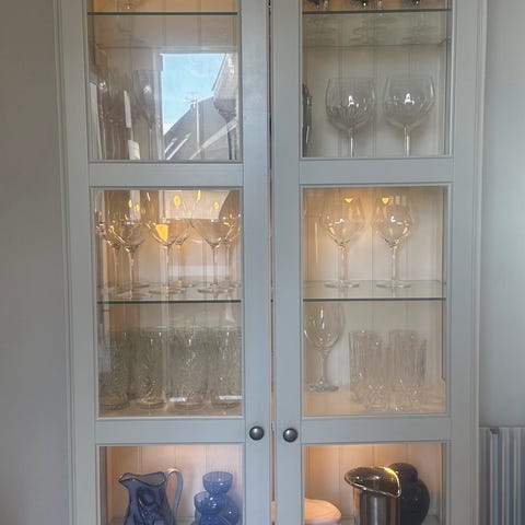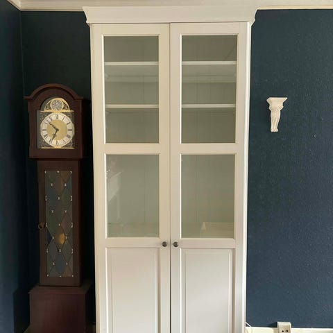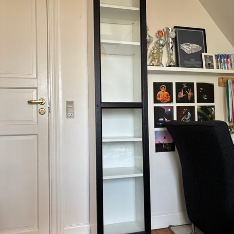 IKEA vitrineskab med glaslåger i hvid. Skabet har øverste del med glaslåger og hylder til opbevaring eller udstilling af service, bøger eller dekoration. Nederste del af lågerne er lukkede paneler, som skjuler indholdet. Indvendigt er der flere justerbare hylder. Skabet står på en lav sokkel og har runde metalgreb på lågerne. Velegnet til stue, spisestue eller kontor, hvor der er behov for kombineret opbevaring og udstilling. Har stået i min. fem år, så det har lidt slitage.