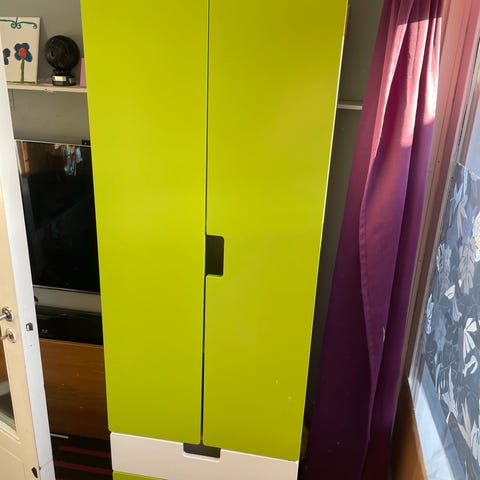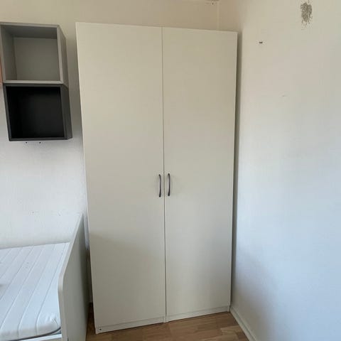 IKEA garderobeskab med hvid låge og indvendige trådkurve.