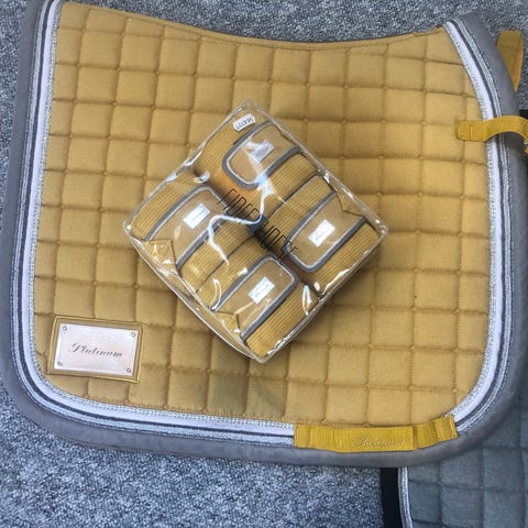 Sadelunderlag til dressur i orange med Glimmer mønster. åndbar tekstil med små firkantede felter for bedre trykfordeling og komfort til hesten. Kantbånd i sort med lyse striber. Størrelse mærket med 17. Velegnet som underlag mellem sadel og hest for at beskytte hestens ryg og fordele trykket jævnt.