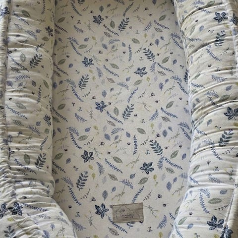 Cam Cam Copenhagen babynest i lys cremefarve med små diskrete prikker i printet. Babynesten har bløde, polstrede kanter hele vejen rundt og en liggeflade i samme mønster. Medfølgende aftageligt betræk i brun/mocca-farve, som kan trækkes udenpå babynesten. Velegnet til spædbørn som tryg sove- og hvileplads i hjemmet, barnevogn eller på rejser. Materiale fremstår som blødt vævet tekstil. Eventuelle brugsspor kan forekomme på liggefladen.