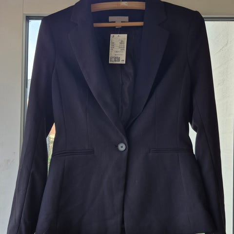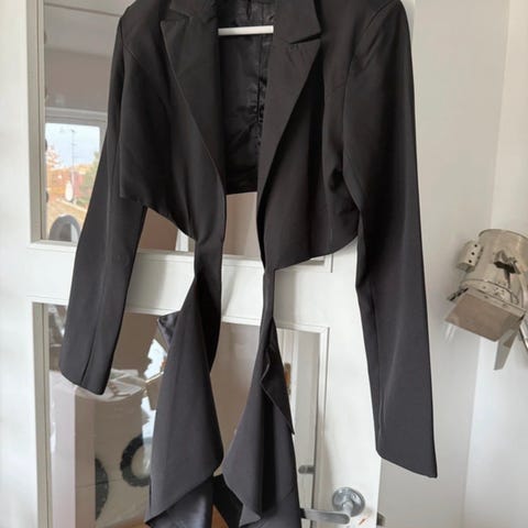 Part Two blazer til kvinder i størrelse M. Blazeren er sort og fremstillet i 40% uld / 60% polyester. Dertil er den trimmet med sort kalveskind.