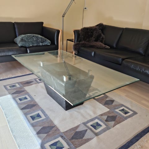 Kvadratisk flot sofabord på sorte metalben. Hærdet glas uden brugsspor.