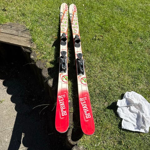 Dynastar ski med bindinger i hvid og rød. Alpinski egnet til pistkørsel. Skiene har integrerede bindinger monteret på plade. Farvekombination i hovedsageligt hvid med røde og sorte detaljer. Velegnet til brug på præparerede pister.