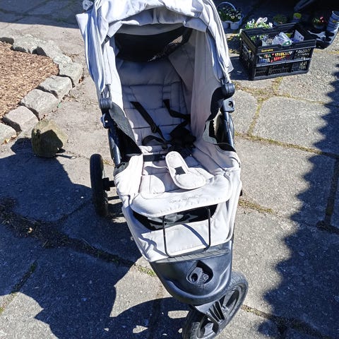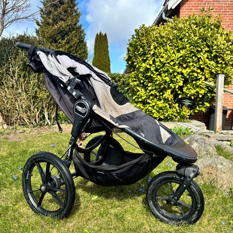 Baby Jogger x3. Vognen har tre store lufthjul, hvor de to baghjul er faste og forhjulet er drejeligt. Den er udstyretmed justerbare kaleche og vinduer, så barnet kan ses under kørslen. Der er fempunktssele i sæderne samt fodstøtter. Vognen har en rummelig varekurv under sæderne og opbevaringslommer bagtil. Håndtaget er helt tværs over vognen for nem styring med én eller to hænder. Velegnet til transport af børn på gåture eller hverdagsture i byen og på mere ujævnt underlag.