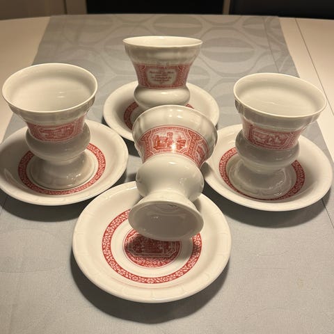 Jan Becher Karlovarská Becherovka porcelænskop hvid med blå tryk og guldkant