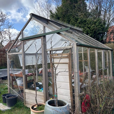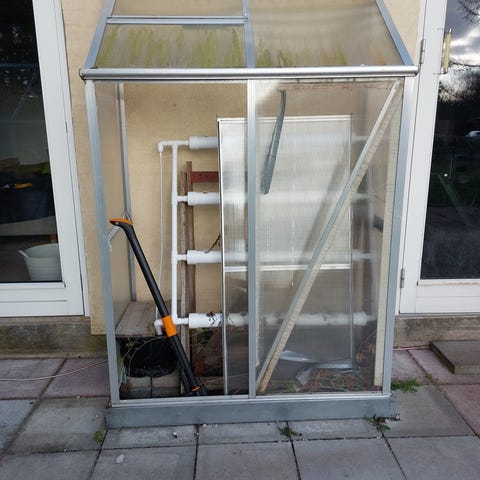 Vores forsythia skal lade livet for et drivhus. Den er ca. 2 m. høj og 3 m. bred - se bord + vandkande for målestok. Den er ikke gravet op, men kan afhentes gratis.