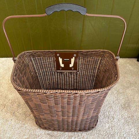 Klassisk lys pile/rattan flettet kurv med god solid hank og bøjle til at hænge på styret