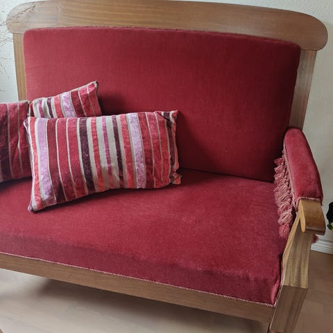 Træsofa med røde hynder
