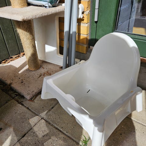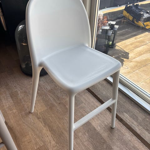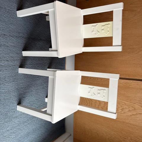 IKEA børnestol i hvid plast. Stolen har hel ryglæn og sæde i formstøbt plast med tværstiver mellem forbenene. Egnet som siddeplads til børn ved bord, legeområde eller værelse. Neutral hvid farve, der passer ind i de fleste indretninger. Let at tørre af og flytte rundt efter behov.