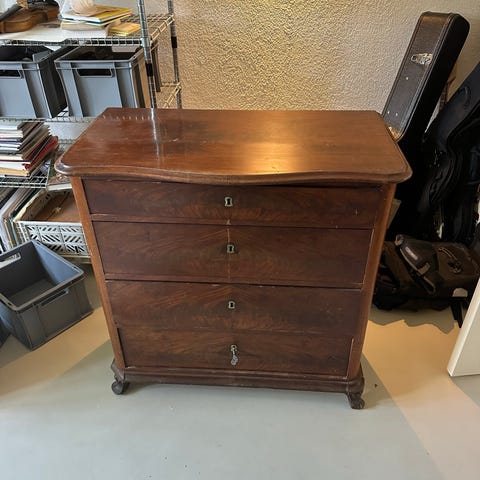 Rigtig fin lille gammel kommode med tre skuffer. Flot og ikke ødelagt nogen steder. Skufferne kører perfekt.