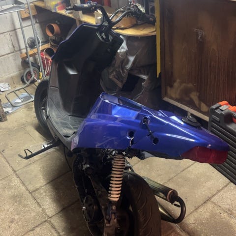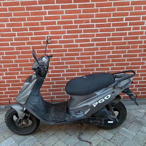 PGO scooter i hvid farve. Modellen fremstår som en klassisk PGO-knallert med plads til én person. Scooteren har analog speedometer og brændstofmåler i instrumentbrættet. Velegnet til daglig transport på korte og mellemlange strækninger i by og omegn. Yderligere specifikationer som motorstørrelse, årgang og udstyr fremgår ikke af oplysningerne og bør derfor afklares med sælger.
