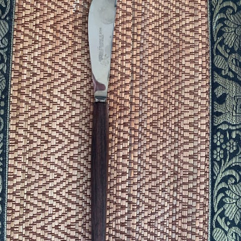 11 Middagsknive med træ-eller benskaft altid håndvasket - Mærket med Paris - men er danske da det står rustfrit stål 23. cm