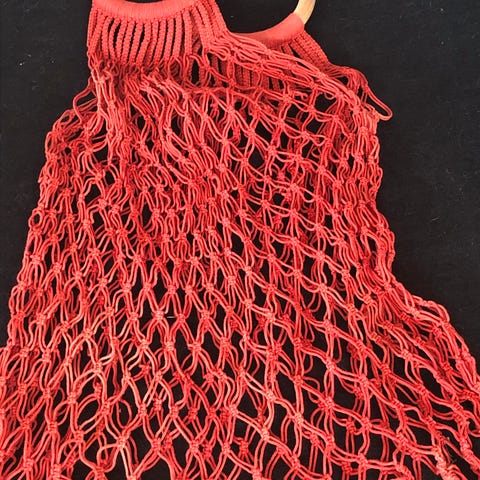 Net, Retro, Net i rødt og hvidt retro stof. God barne størrelse. Måler 25 x 29 cm i posen. Og hankene ca 40cm.