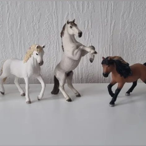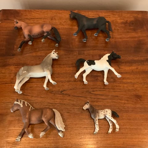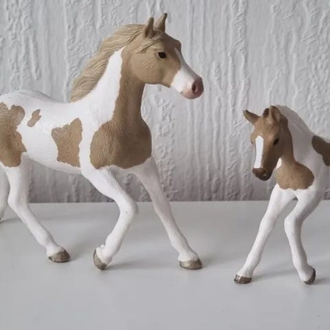Schleich hestefamilie legetøjsfigurer. Sættet består af flere hestefigurer i forskellige størrelser, herunder voksne heste og føl. Figurerne er naturtro malet i lyse nuancer med mørk man og hale. Der medfølger også et lille stykke udstyr/grime til hest, som kan bruges sammen med figurerne. Velegnet til leg med bondegård, heste og dyrefigurer.