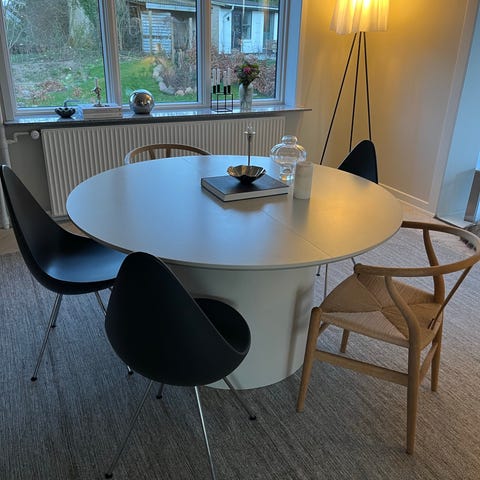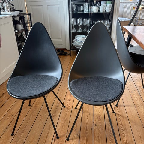 Sælger 4 originale Dråben-stole (The Drop™) designet af Arne Jacobsen (Fritz Hansen). Alle fremstår i super fin stand, med meget få forbrugsspor.