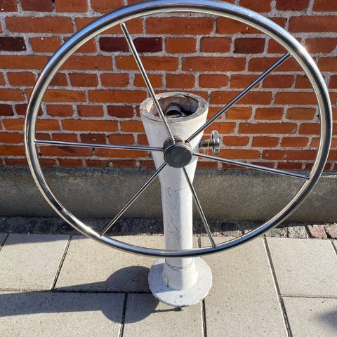 Rat til båd i lys farve. Rattet har tre eger med udskæringer til greb og en rund centerplade uden logo. Egnet som erstatningsrat eller til projektbil, ombygning eller reservedele. Materiale og præcise mål er ikke oplyst.
