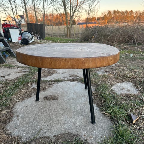 Rundt sofabord i metal i beige farve. Bordet har en høj kant hele vejen rundt og en plan bordplade. Velegnet som sofabord eller loungebord både inde og ude, afhængigt af materiale og behandling. Der ses enkelte brugsspor og ridser på overfladen og på siden af bordet, som vist på billederne.
