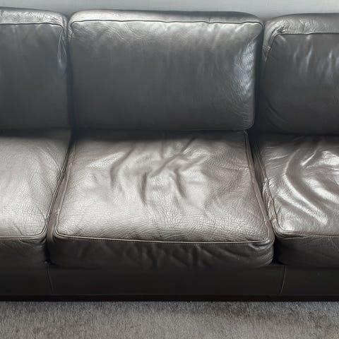 Lækre tidløse lædersofaer i cognacfarve med tremmesider i eg.