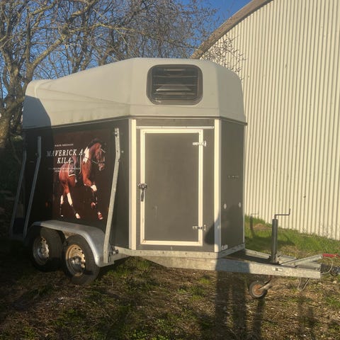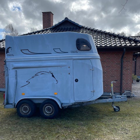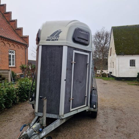 Henra Grand Chevalier hestetrailer med to aksler i lysegrå farve. Trailerens konstruktion er velegnet til transport af heste, med høj overbygning og vinduer i fronten for lysindfald og ventilation. Udstyret med bagdøre, sidedør samt lygter og reflekser bagtil. Monteret med alufælge og næsehjul ved trækstangen. Egnet til kørsel med heste eller som lukket trailer til transport af udstyr, foder eller lignende gods, hvor der ønskes beskyttelse mod vejr og vind.