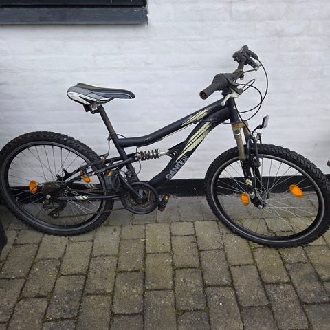 Børne mountainbike med 24" hjul i grå og blå farve. Cyklen har brede dæk med mønster, som egner sig til kørsel på både grus og asfalt.