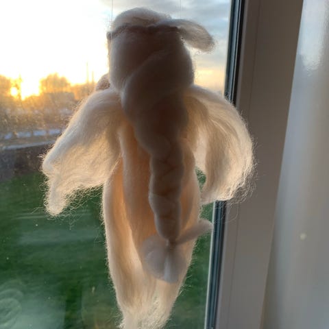 Håndlavet engel i uld, udført i merino uld i naturfarver. Figuren har langt, brunt uldskørt og lys overkrop med fletning samt lyse uldvinger. Englen er udformet som hængedekoration og kan fx bruges som uro eller pynt i vindue eller ophængt i et rum. Velegnet som dekoration i hjemmet eller på børneværelset. Eller i sommerhuset.