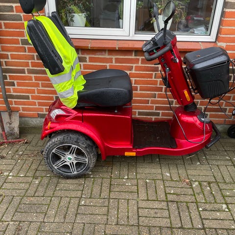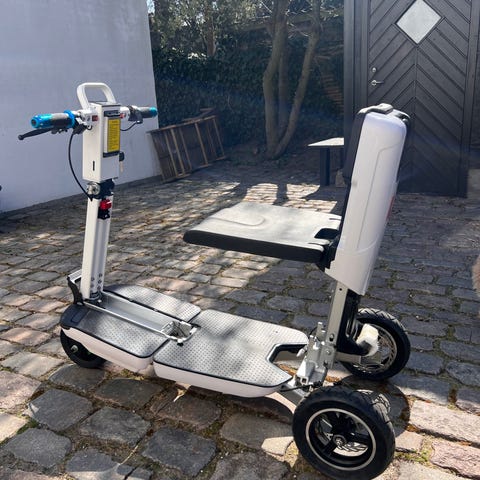 El-scooter 3-hjulet i grå med sort sæde. Modellen har stort fodpanel, forlygte, blinklys og baglygter. Sædet er polstret med høj ryg, armlæn og nakkestøtte samt mulighed for justering og drejning. Der er monteret trådkurv foran til opbevaring af mindre ting samt bøjle bagpå til montering af tilbehør. Scooteren styres med styr med håndtag, spejle og betjeningsknapper på styret, egnet til persontransport på korte og mellemlange ture på jævnt underlag.