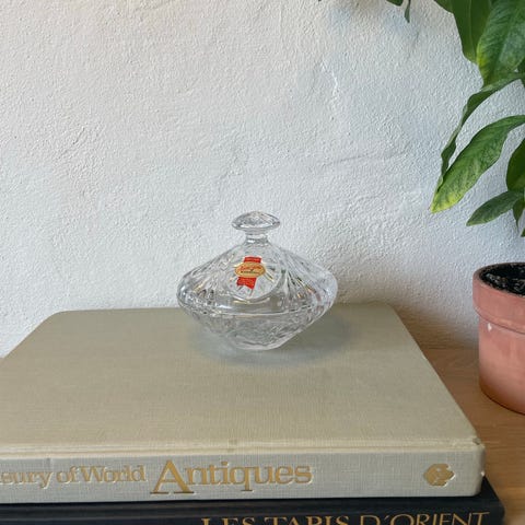 Antik krystal skål, Elisabeth Hutte, Bonbonniere i ægte Bøhmisk højglanspoleret blykrystal fra kunstner Elisabeth Hutte. Motiv i rødt med fugle.