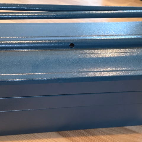 Værktøjskasse i metal i grønlig farve. Kassen har bærehåndtag og flere rum, som foldes ud ved åbning. Egnet til opbevaring og transport af værktøj eller andre småting i hjemmet, værkstedet eller garagen.