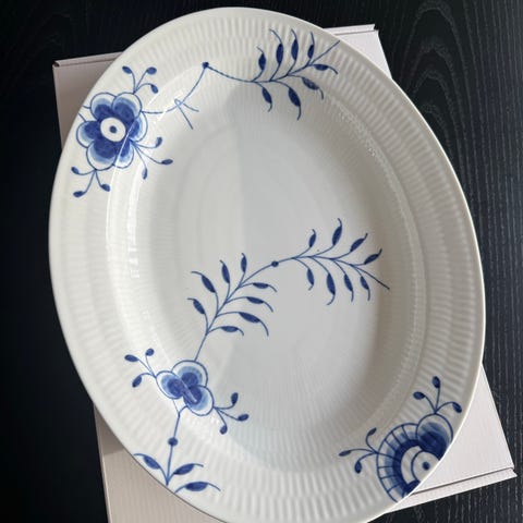 Royal Copenhagen ovalt fad i porcelæn med blå mega mussel